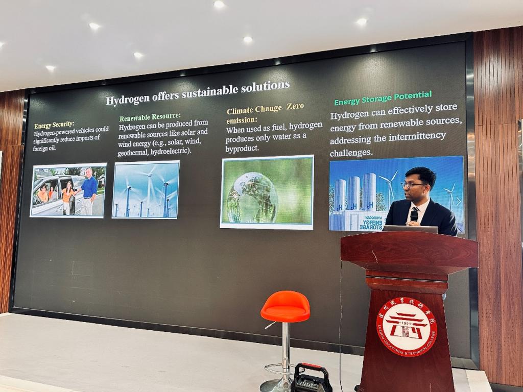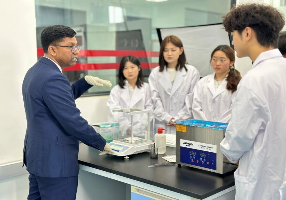 讲座中,Babu博士围绕金属氧化物溶胶‑凝胶制备技术、析氢催化机理、材料结构与性能调控、新能源催化应用前景等核心内容展开系统讲解。他结合自身主导多项科研项目并推动成果产业化的丰富经验,向师生们分享了前沿科研成果与工程实践案例。现场学术氛围浓厚,师生们积极互动,就材料制备工艺、催化性能优化、实验室研究方向等专业问题与主讲人进行了交流与探讨。